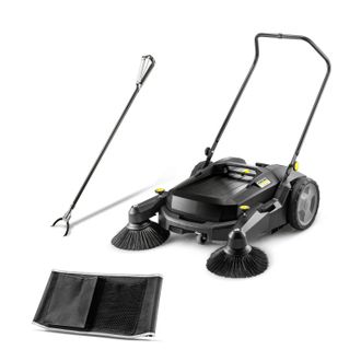 Компактная ручная подметальная машина Karcher KM 70/20 C 2SB Anniversary Edition выпущена к 90-летнему юбилею компании Karcher, модель черного цвета, в комплектацию которой дополнительно включены щипцы для крупного мусора и сумка для принадлежностей. KM 70/20 C 2SB Anniversary Edition с роликовой и двумя боковыми щетками работает по принципу «совка для мусора», поэтому проста в эксплуатации. Отходящий воздух, поступающий вместе с пылью в контейнер за счет вращения щеток, проходит через фильтры пылеподавления.